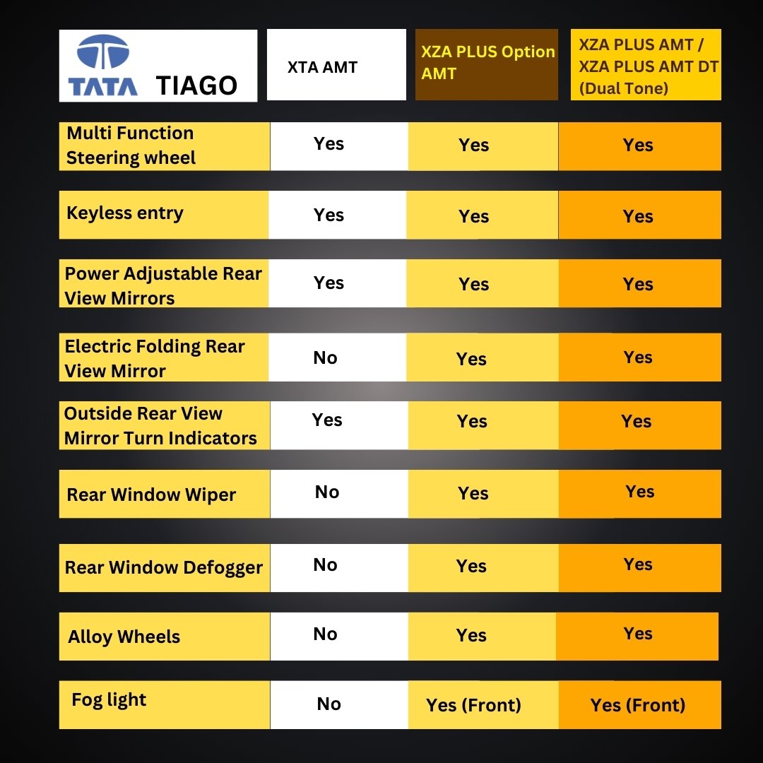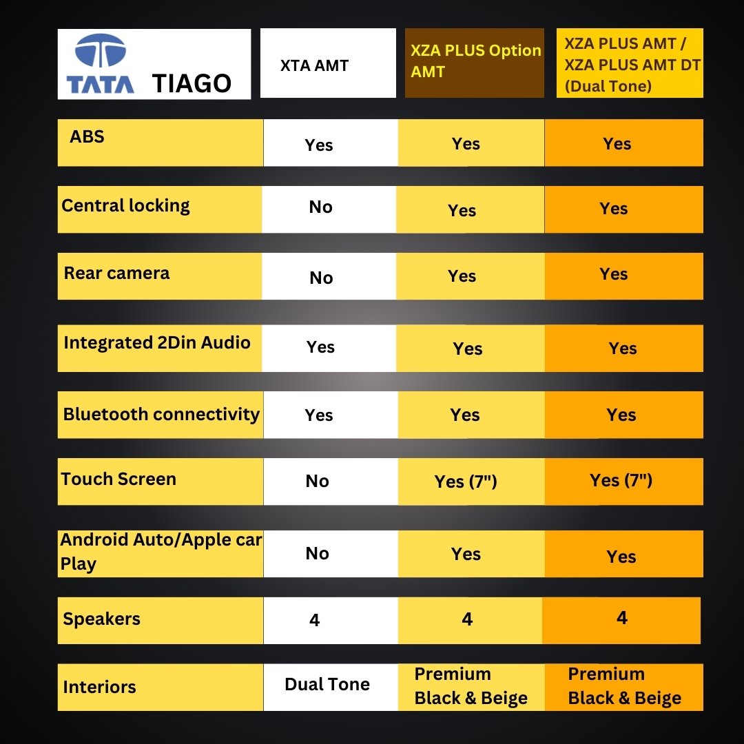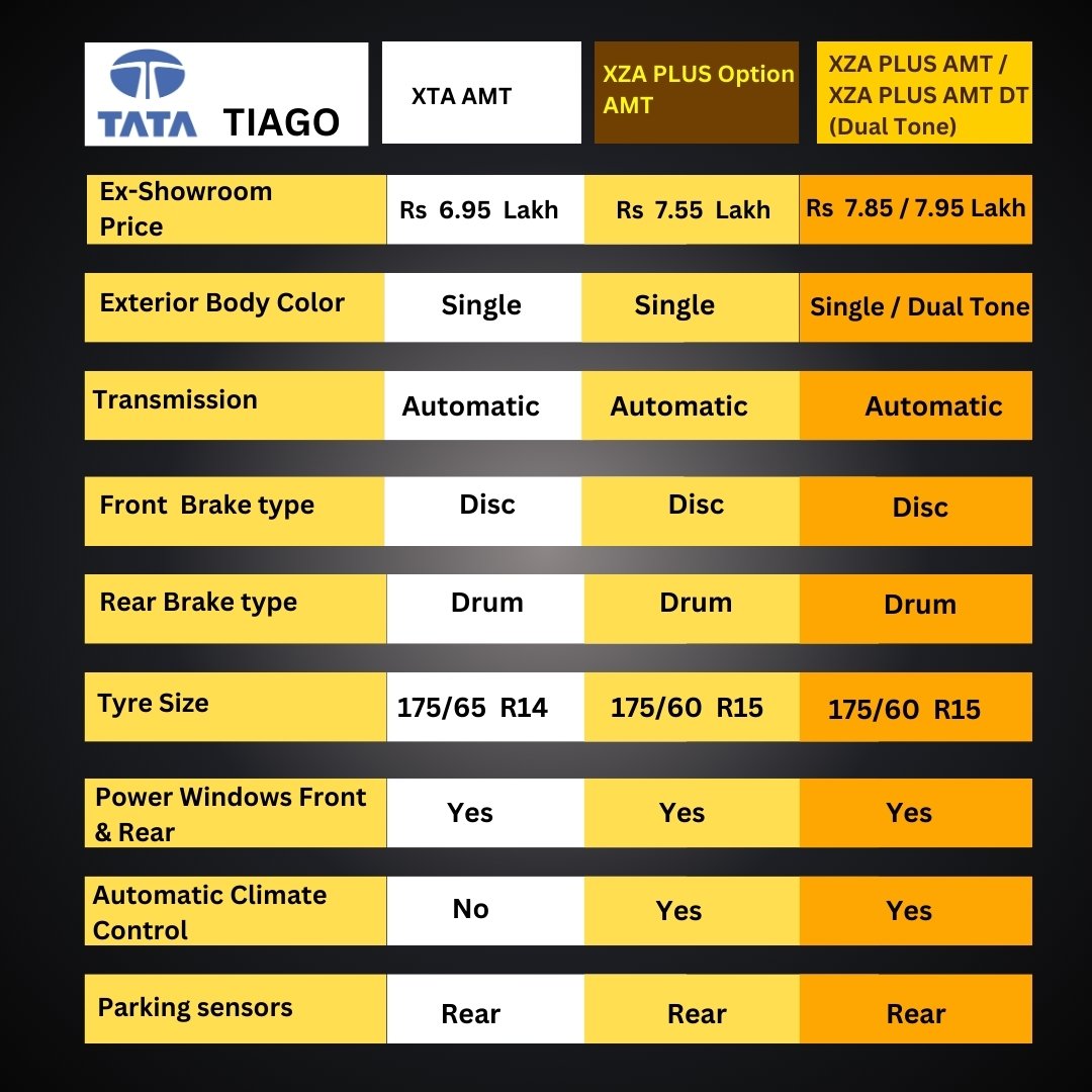 Tata Tiago - XTA AMT, XZA Plus Option AMT, XZA Plus AMT, XZA Plus AMT DT